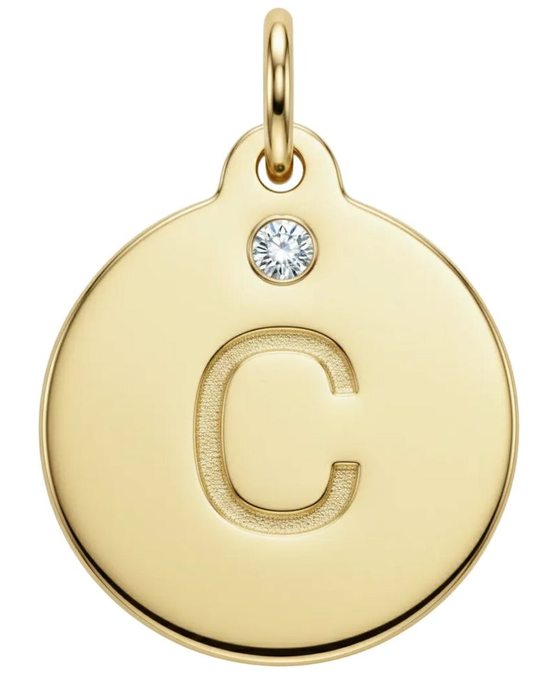 Celebrate your signature style with the Helen Ficalora Alphabet Charm Letter "C" with Diamond. Meticulously handcrafted in Solid 14k Gold (Yellow, White, or Rose), this iconic 1/2" disk features the letter "C" deeply stamped into the gold, accented by a genuine **1.5mm Diamond**. It is the perfect blend of timeless elegance and personal sparkle.