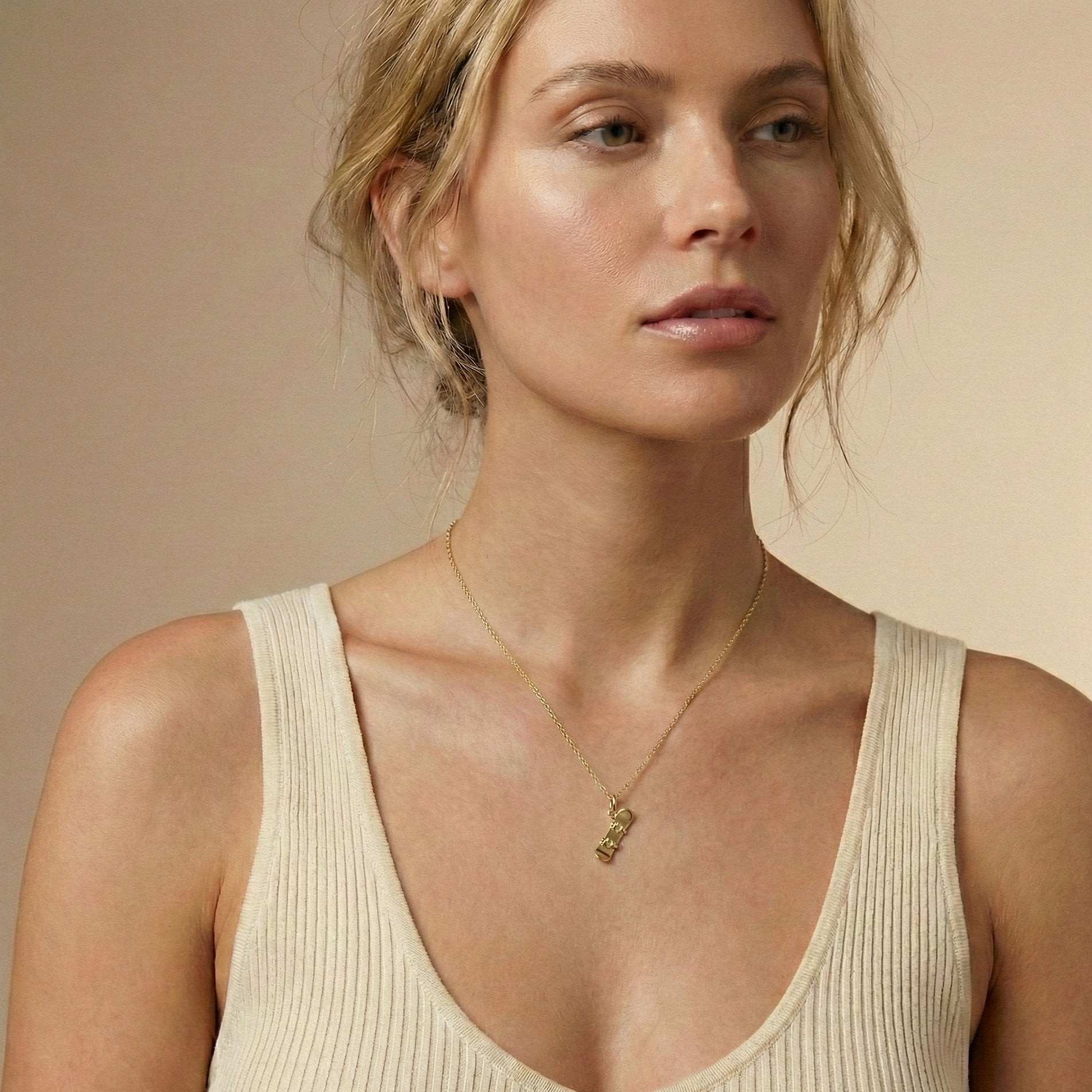 • The Powder Day Solo: Wear this gold snowboard pendant on a sturdy Fine Gold Chain. Its vertical drop looks effortless over a sweater or thermal layer during après-ski.