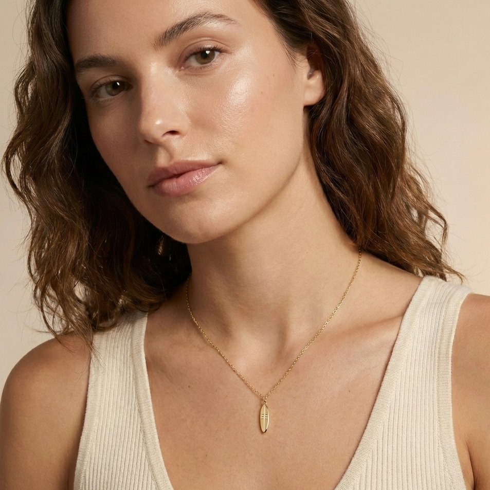 - The Surfer Girl Solo: Wear this mini gold surfboard on a shimmering Fine Gold Chain. Its elongated shape differentiates it from standard round charms, making it an eye-catching conversation piece at the beach or the office.