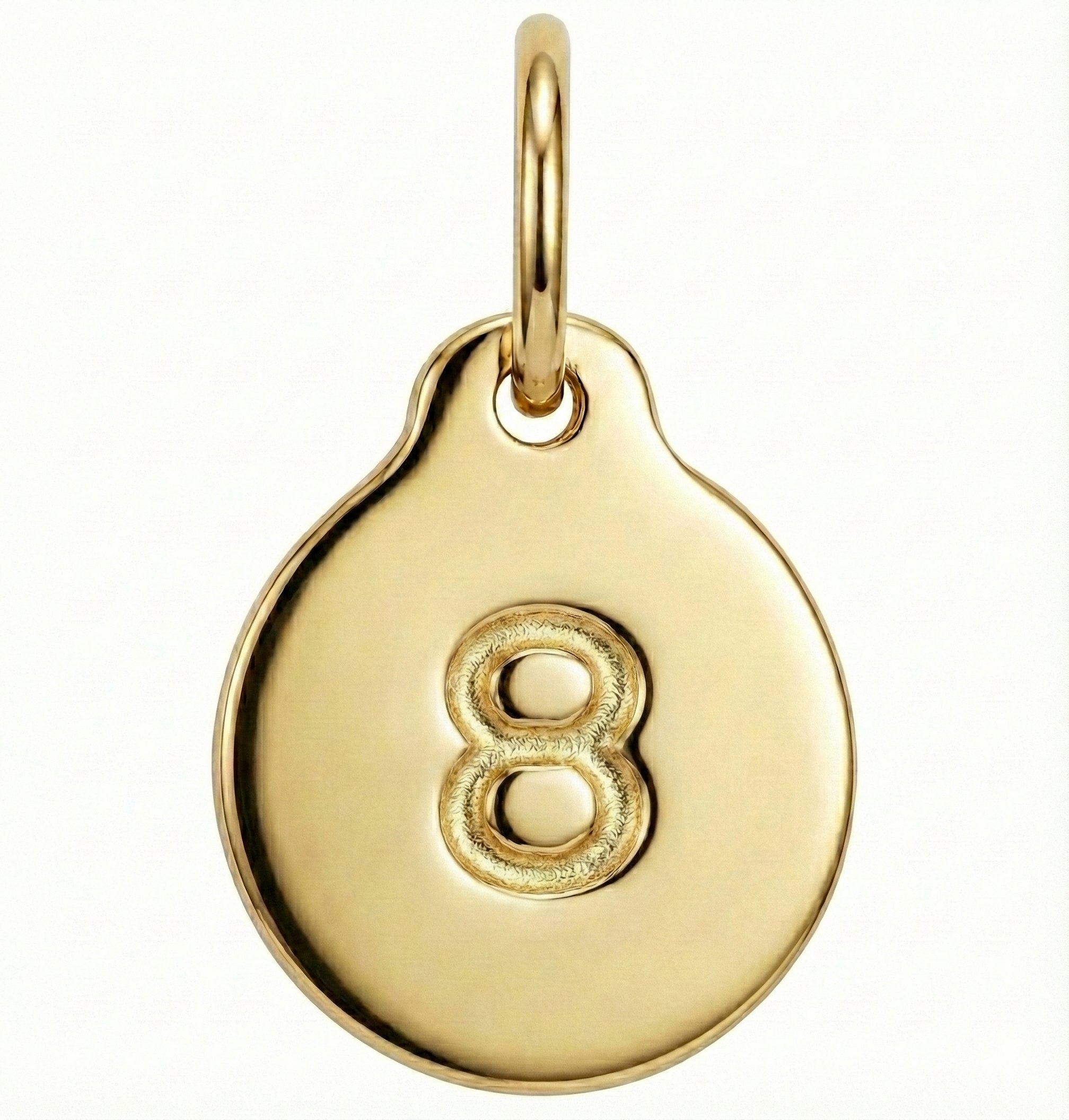 Celebrate your special moments with this number 8 charm pendant—crafted from solid sterling silver or luxurious 14K yellow, white, or pink gold—for a personalized jewelry piece that carries meaning. Sized at approximately 10.6 mm x 8.6 mm, this gold number charm (or silver number charm, depending on your choice) is the ideal accent on a necklace chain or charm bracelet, allowing you to show off your lucky number, birthdate, or milestone anniversary. Its polished finish ensures long-lasting shine and durability while remaining lightweight for everyday wear. Whether gifting a lucky number jewelry item to a friend or family member, or treating yourself, this number 8 charm makes a thoughtful personalized gift. The piece arrives beautifully gift-wrapped, comes with free express shipping, and is ready to delight. Pair it with other charms for a layered look, or let it stand alone as a sleek, modern statement. With premium materials and craftsmanship, this number 8 necklace charm is more than just an accessory—it’s a keepsake you’ll treasure forever.
