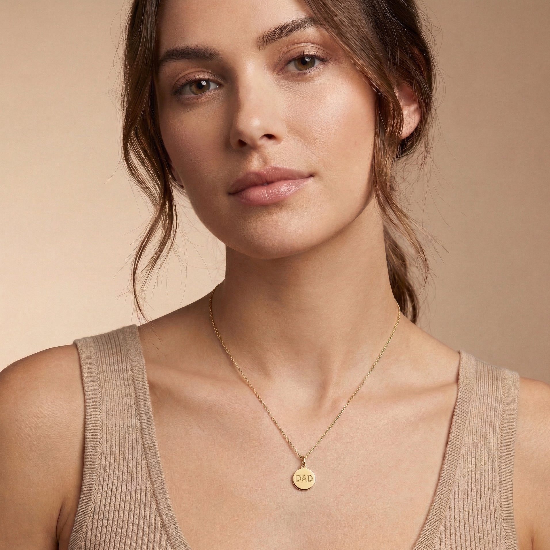 - The Heartfelt Necklace: String this solid gold Dad disk onto a durable Fine Gold Chain. Its flat, polished profile rests smoothly against the skin, making it a comfortable everyday piece.